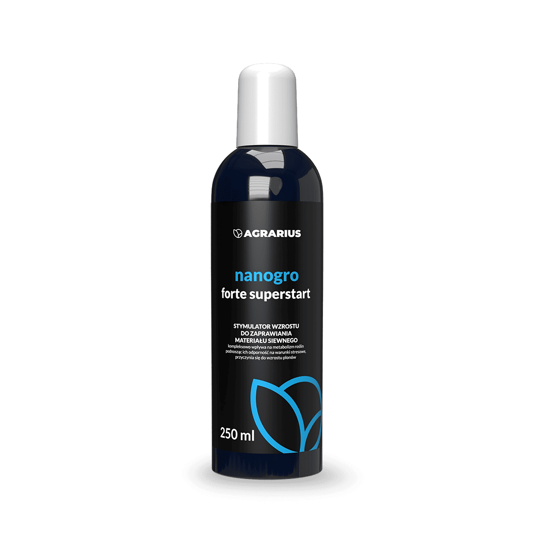 Preparat nanogro forte superstart do zaprawiania nasion to zaawansowana i innowacyjna formuła preparatu, na którą składają się siarczany metali w nanomolowym stężeniu oraz najnowszej generacji kwasy humusowe pochodzące z przetworzonej ligniny. Stosowanie zaprawiania nanogro forte superstart na nasiona, stymuluje naturalne siły rośliny do wykorzystania ich maksymalnego genetycznego potencjału. Dzięki temu nasiona zaprawione preparatem wykazują znacznie szybsze i bardziej skuteczne kiełkowanie nawet w trudnych warunkach glebowych i atmosferycznych takich jak susza oraz niskie lub wysokie temperatury. Preparat wnika do rośliny, aktywując jej naturalny mechanizm obronny i tym samym pobudzając produkcję substancji zapasowych, takich jak cukry, białka i naturalne hormony. Zaprawianie nasion nanogro forte superstart pozwala roślinom uniknąć problemów zarówno z jesienną suszą podczas kiełkowania, jak i wiosenną posuchą podczas wegetacji. Zaprawianie cebul, bulw i korzeni sadzonek prowadzi do mocniejszego ukorzenienia oraz przyjęcie się na stanowiskach.